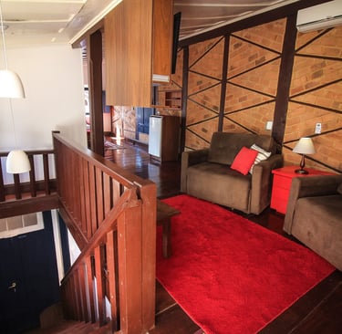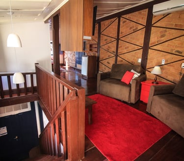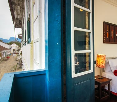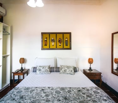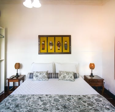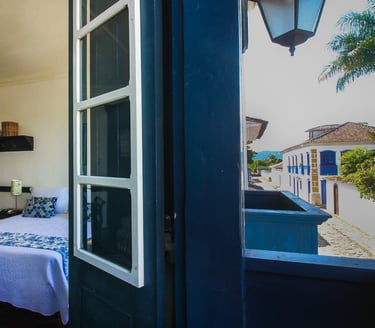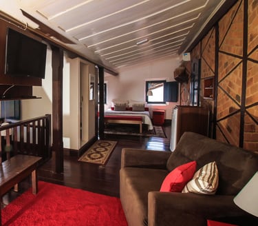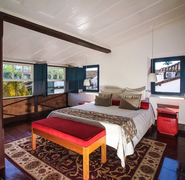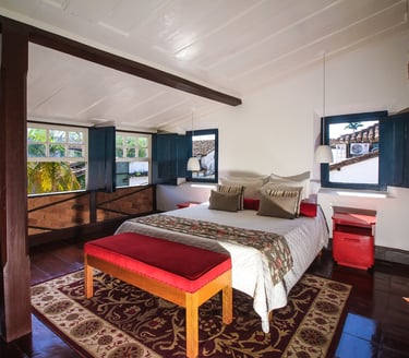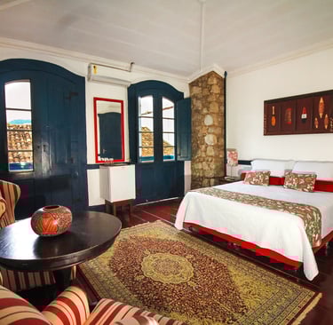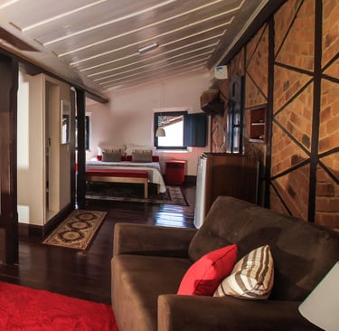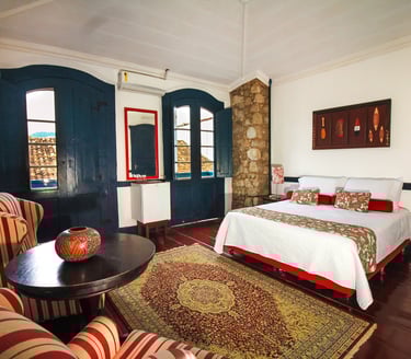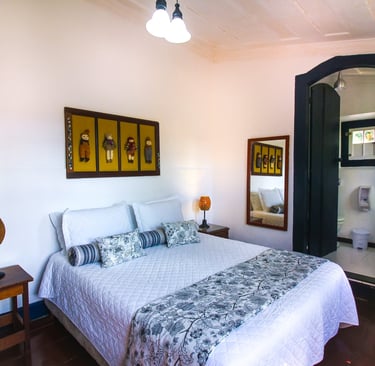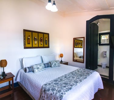Com toques coloniais e decoração aconchegante, esta suíte para duas pessoas dispõe de uma cama de casal queen size, enxoval de algodão egípcio, ar-condicionado, frigobar e televisão de tela plana, criando uma experiência única.