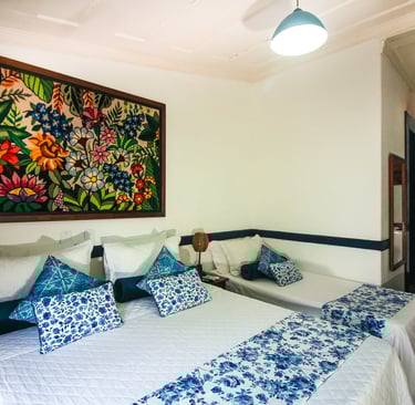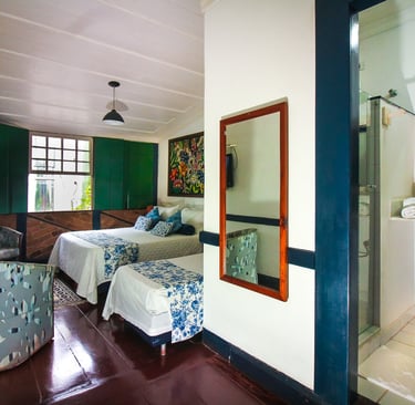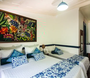 Ideal para famílias ou grupos, acomoda até quatro pessoas em um ambiente de inspiração colonial, com uma cama de casal queen size e duas camas de solteiro. Conta com enxoval de algodão egípcio, ar-condicionado, frigobar e televisão de tela plana, proporcionando um conforto clássico.